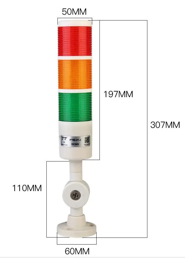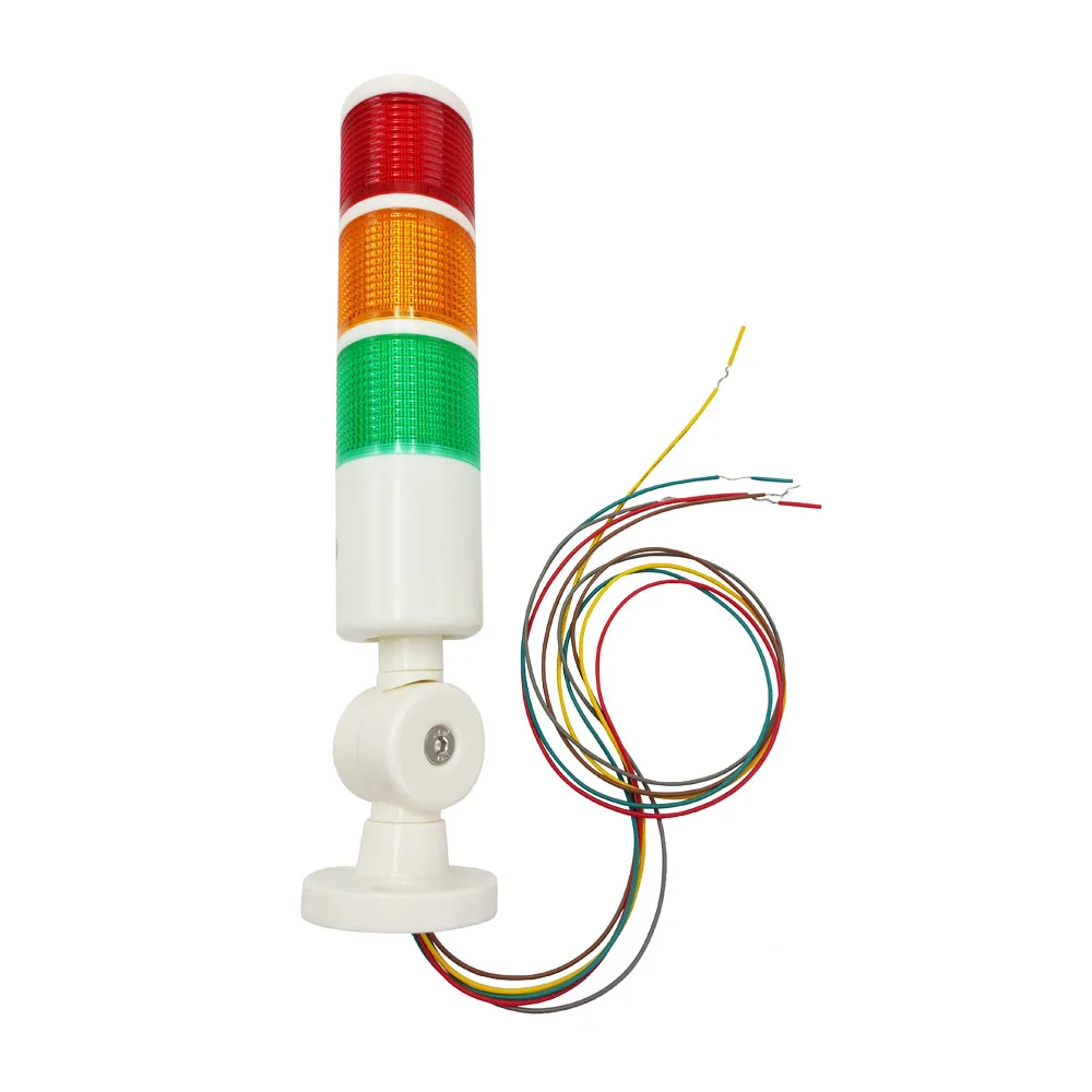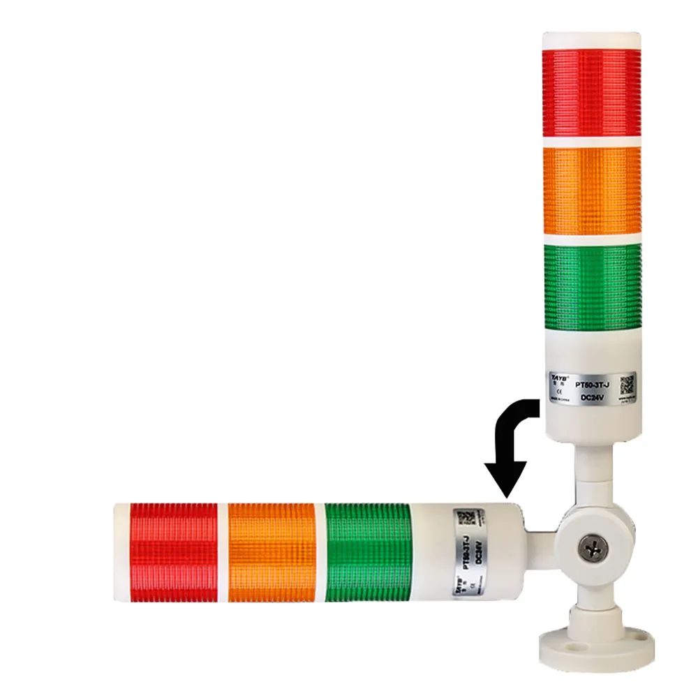 PT50-3T-J Светодиодная сигнальная колонна трехцветная с зуммером 85дБ, Постоянное свечение, универсальное крепление с изменением угла наклона, Питание 24VDC, цвета: красный, желтый, зеленый, IP40