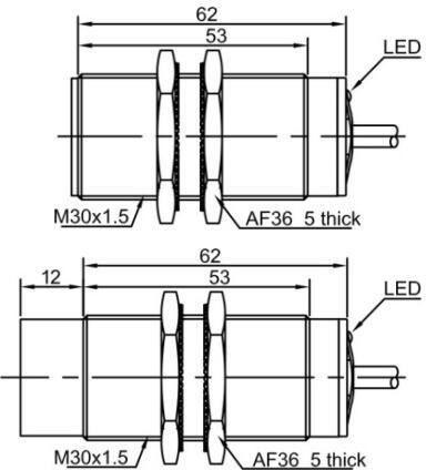 LR30XCF10LUM Индуктивный датчик цилиндрический M30x62 мм, заподлицо, аналоговый выход 0-10В, медно-никелевый сплав, расст. сраб. Sn=10 мм, IP67, питание 15…30V DC, 200 Гц, кабель 2 м