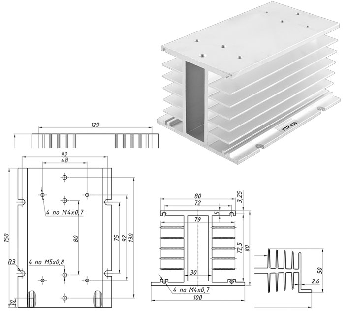 РТР036 Радиатор охлаждения для трехфазного ТТР до 40А, Тепловое сопротивление, RthSA °C/Вт 0,48, размер 150×100×80 мм, вес 855 г/шт.