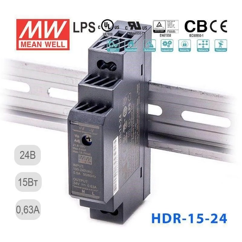 HDR-15-24, Источник питания Mean Well, 24В, 630 мА, 15Вт, диапазон регулировки напряжения 21.6 ~ 29VDC
